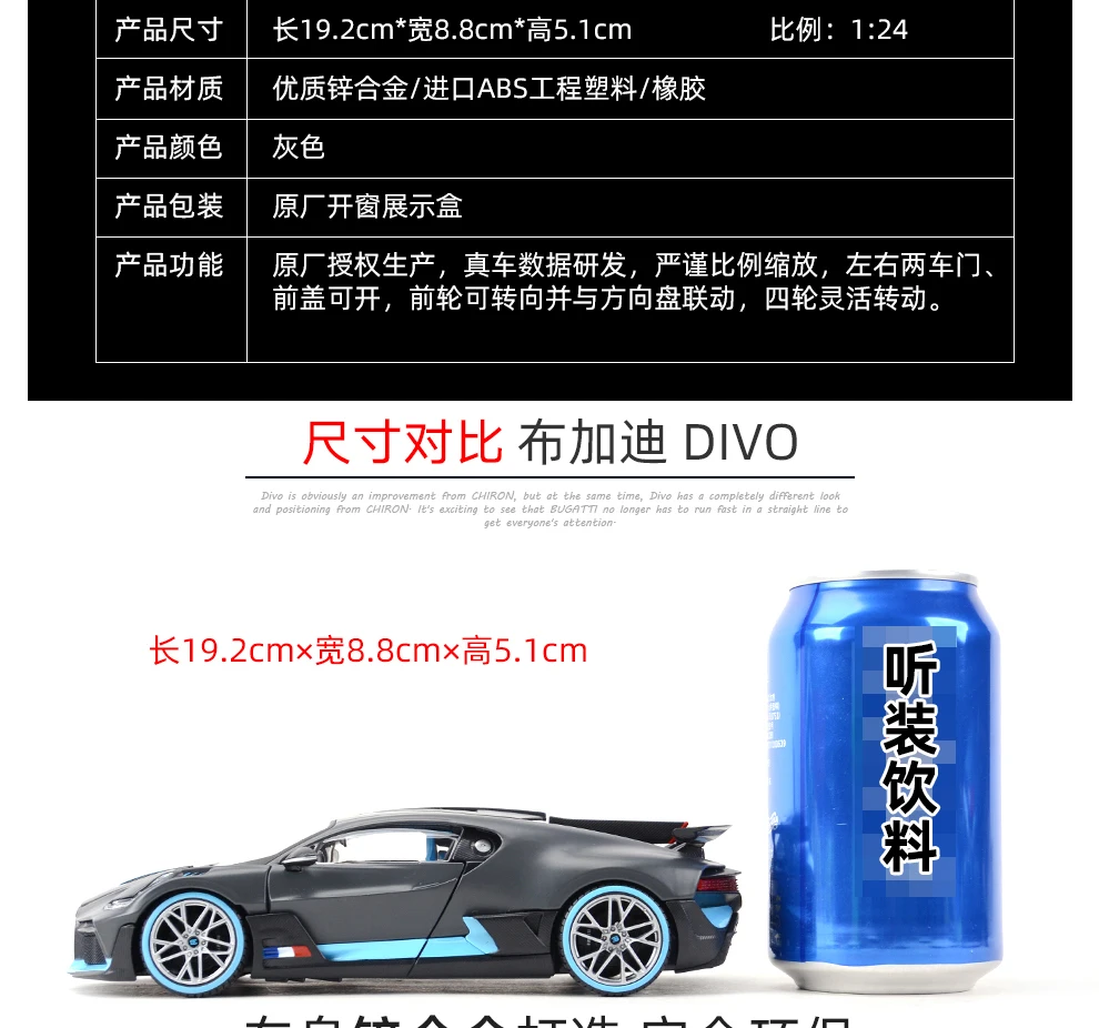 Nazwa: Bugatti Divo Marka: Maisto Rozmiar: około 19.2cmX8.8cmX5.1cm Skala: 1:24 Materiał: odlew metalowy z części z tworzyw sztucznych Kolor: szary Funkcja: ●Doors i przednia okładka otwarte ● Swobodny obrót na cztery koła ● Przednie koła sterują kierownicą