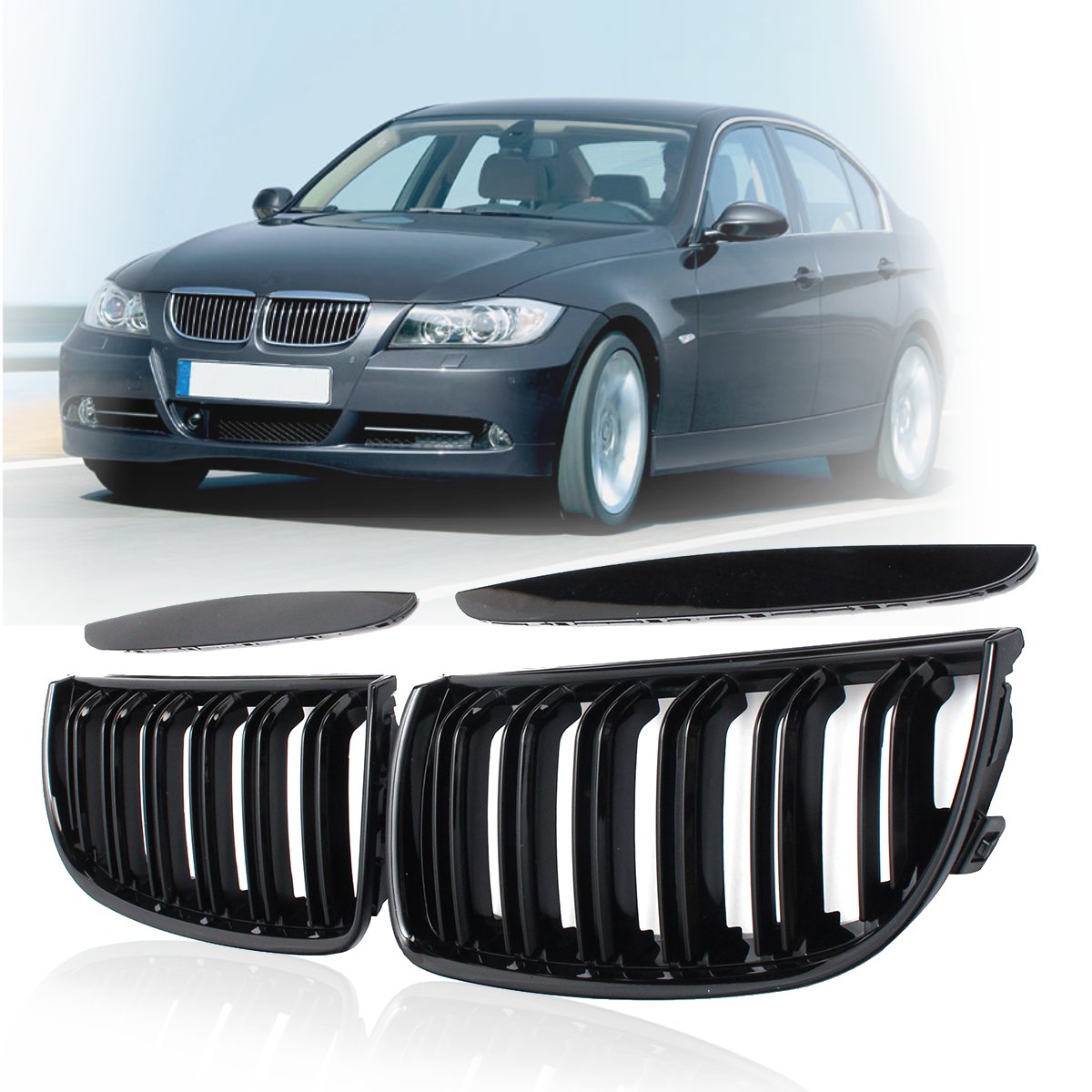 Strona główna / Inne / 4 kolor para przedni połyskowy mat czarne włókno węglowe 2 linii podwójna listwa kratka nerkowa maskownica do BMW E90 E91 4 drzwi 2005 2006 07 2008