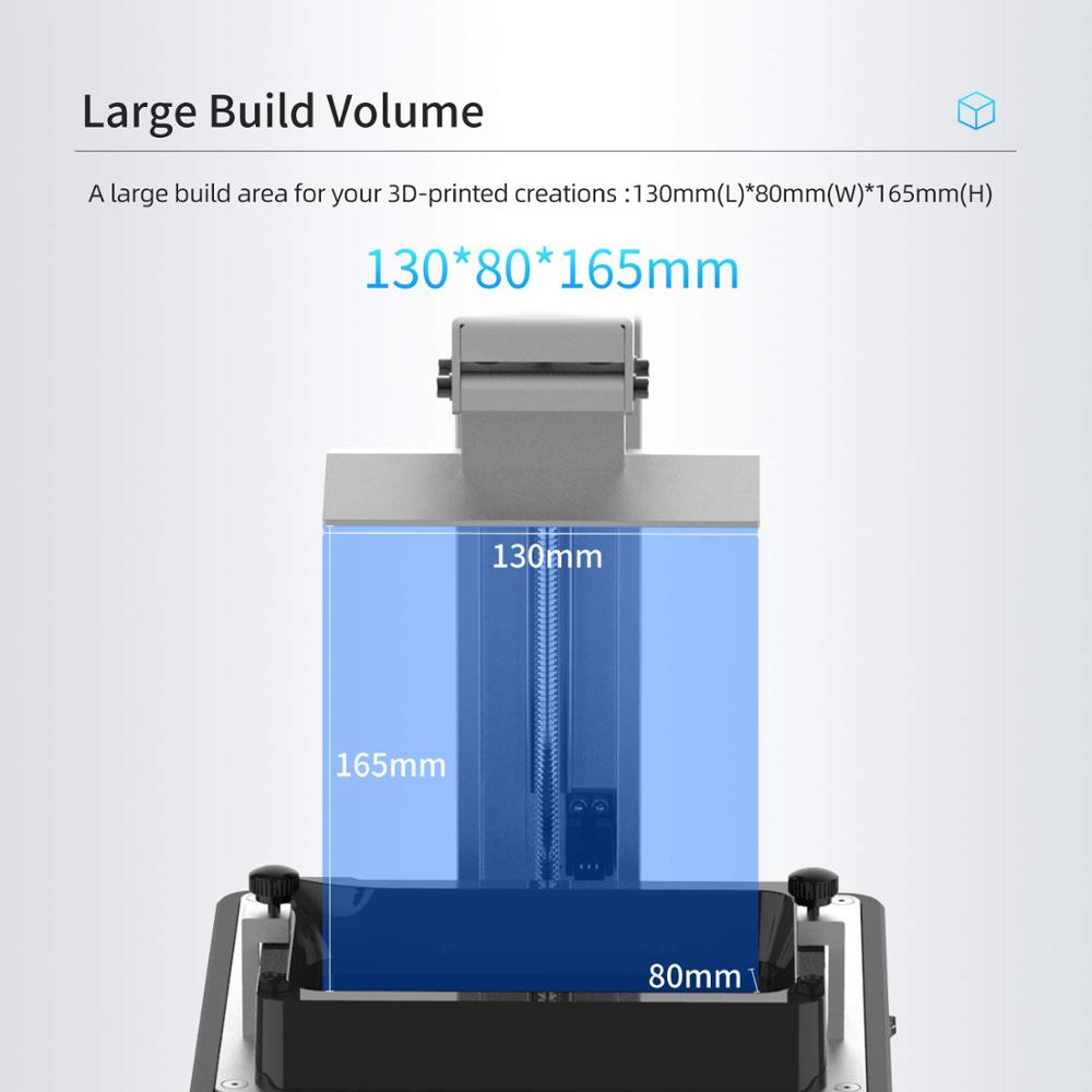 Przestrzeń drukowania Photon Mono 3D wynosi 130mm (L) * 80mm (W) * 165mm (H), co jest znacznie większe niż zwykła drukarka LCD. Masz wystarczająco dużo miejsca, aby wyrazić swoją kreatywność swobodnie.