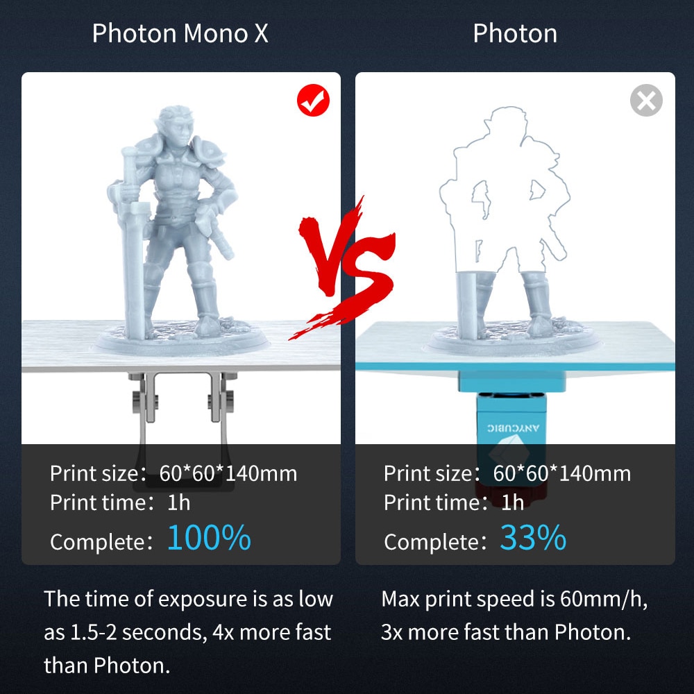 Czas ekspozycji wynosi zaledwie 1.5-2 sekundy, a maksymalna prędkość drukowania wynosi 60 mm/h, dzięki czemu prędkość drukowania jest 3 razy większa niż foton.