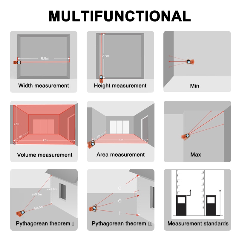 Idealny do dekoracji wnętrz, przebudowy, wykładzin podłogowych i ściennych, oceny i oceny nieruchomości, jest to szybki, łatwy i dokładny sposób pomiaru, nawet przy wychodzeniu.