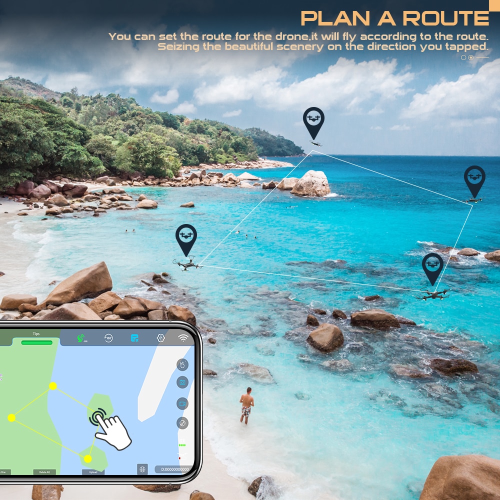 Ustaw więcej punktów na mapie w aplikacji, SP500 drone będzie latać wzdłuż ścieżki narysowanej na aplikacji, aby skupić się na przechwytywaniu zdjęć i filmów, wykorzystać piękna sceneria i zabawy na świeżym powietrzu.