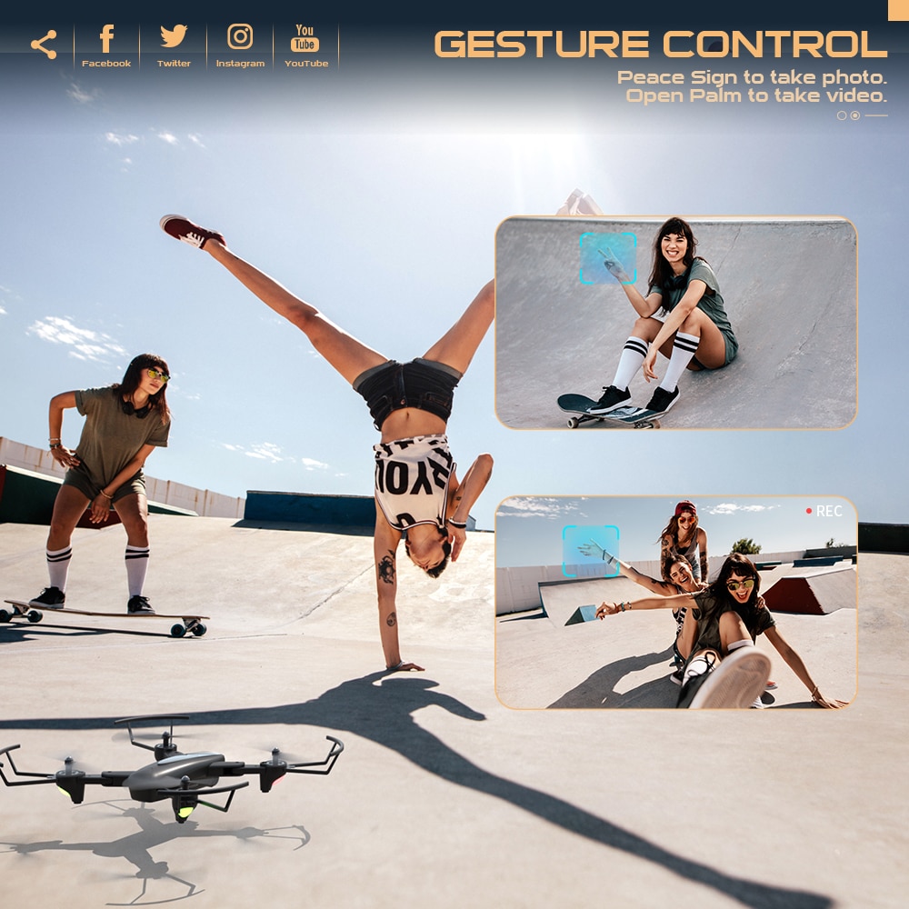 W trybie follow me dron może robić zdjęcia lub nagrywać wideo pod kontrolą gestów, możesz uwolnić ręce i pozować na piękną chwilę. Edytuj i udostępniaj swoje nowe kreacje w mediach społecznościowych!