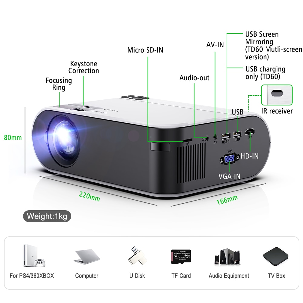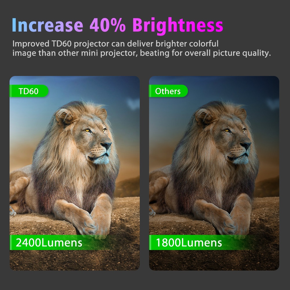 Ulepszony projektor TD60 może dostarczyć jaśniejszy kolorowy obraz niż inny mini projektor, pokonując ogólną jakość obrazu.